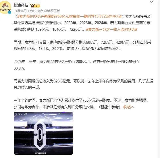 不过和华为合作也有代价,几乎每卖出一辆问界车,就有13.6万元流向华为。2025年上半年,赛力斯营收623.6亿元,向华为支付的采购费就达200亿元,占比足足33%。